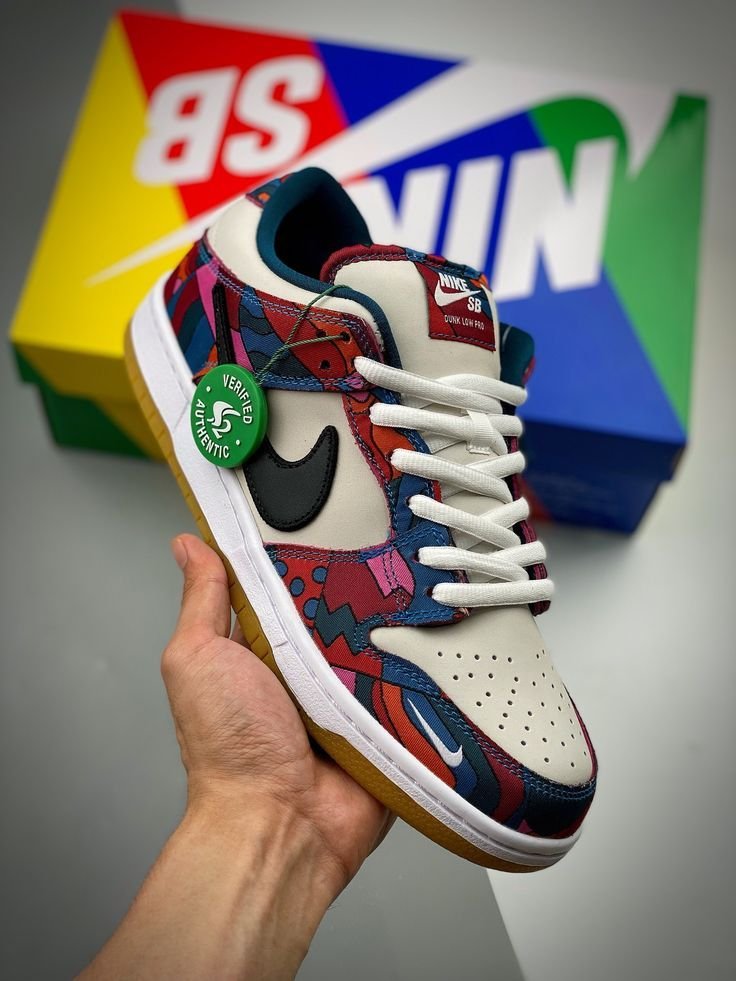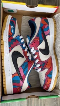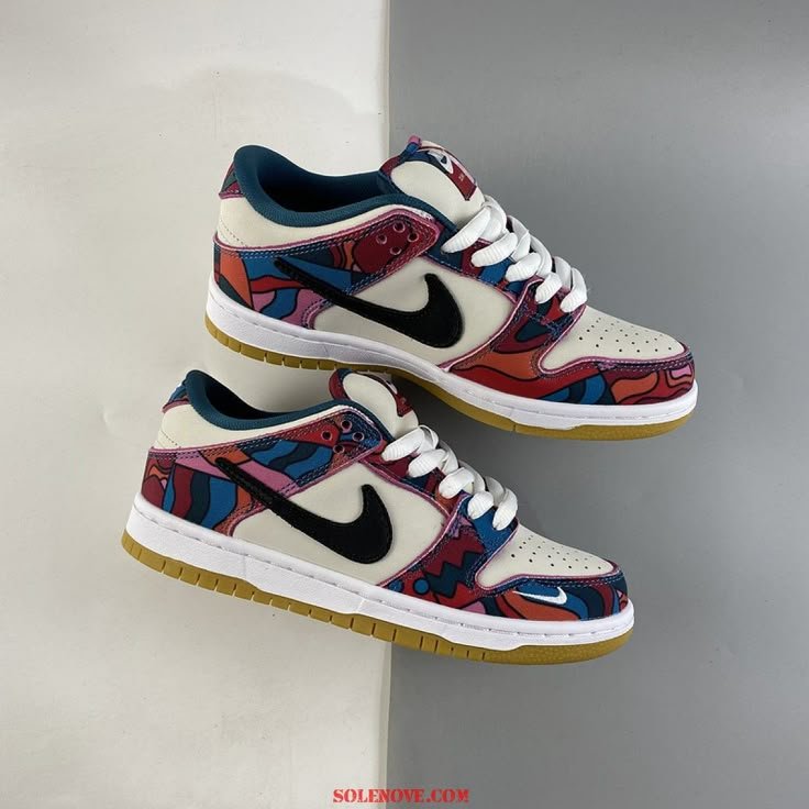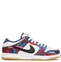 The Parra x Nike Dunk Low SB is drawn from a collaborative series paying tribute to the 2021 Summer Olympics in Tokyo, where the sport of skateboarding makes its official debut. The Dutch artist Piet Parra dresses the low-top in off-white leather with abstract-print textile overlays in a blend of blue, red, pink and teal hues an eye-catching design repeated on Nike SB’s Olympic Federation Kits. A truncated black leather Swoosh adorns the quarter panel, while a white mini-Swoosh is embroidered on the lateral forefoot. A tacky gum rubber outsole provides durable traction underfoot.